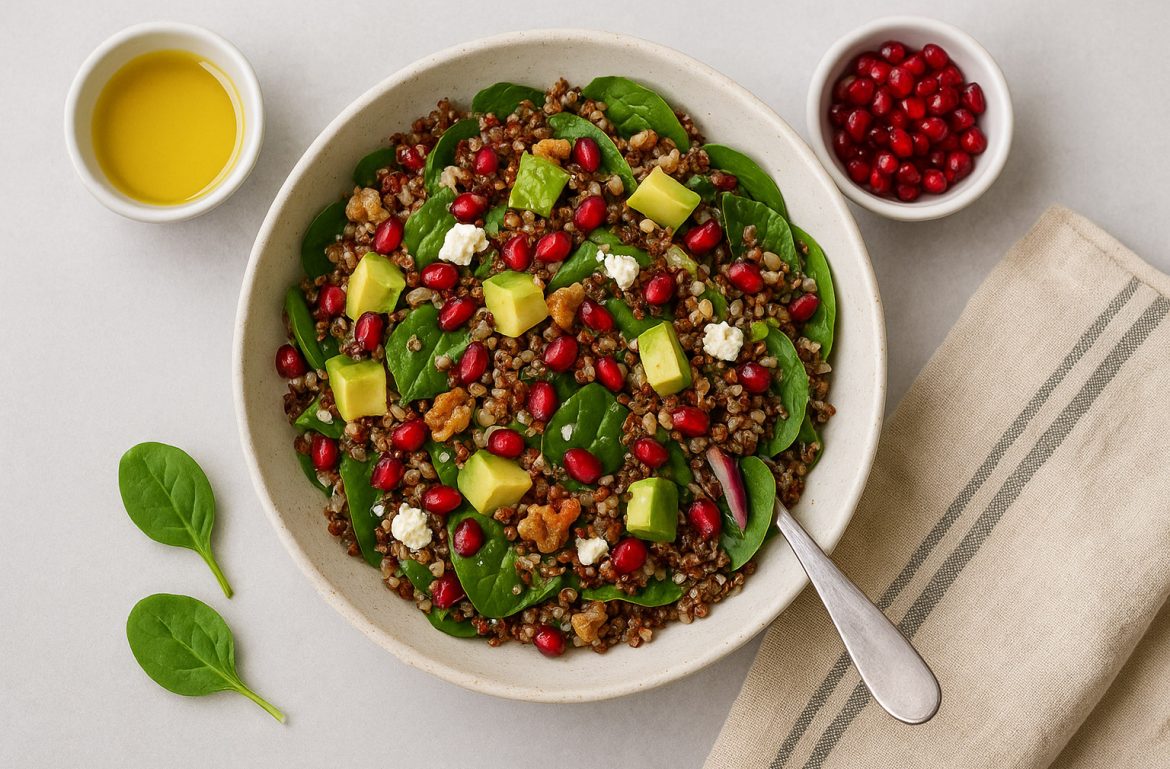 Una ensalada colorida, equilibrada y llena de contrastes: el dulzor de la granada, la cremosidad del aguacate y el toque salado del feta hacen de este plato una opción ligera y deliciosa para cualquier época del año.